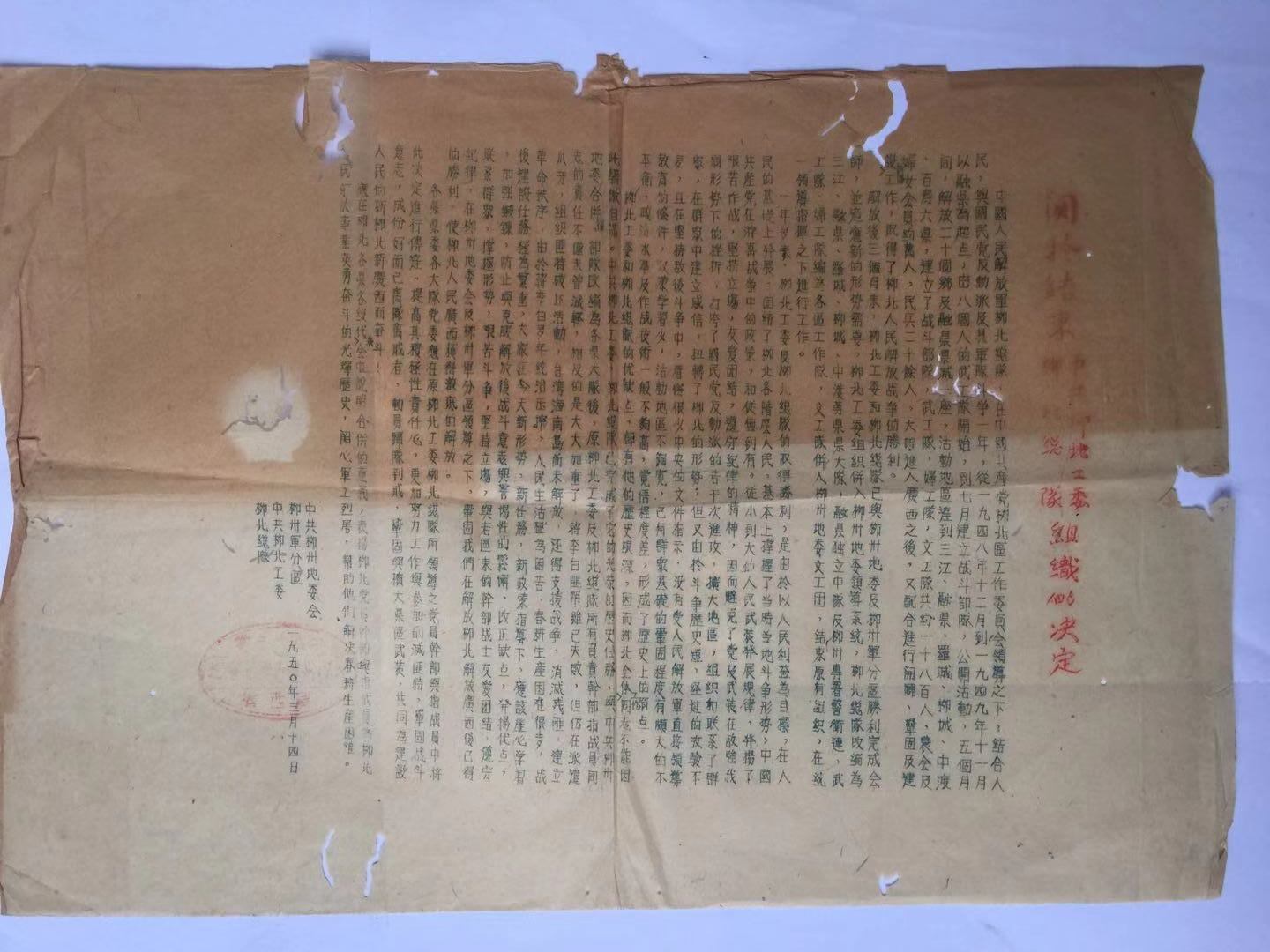 该决定书是1950年3月14日关于结束中国柳地工委柳北总队组织的决定,为馆内旧藏。