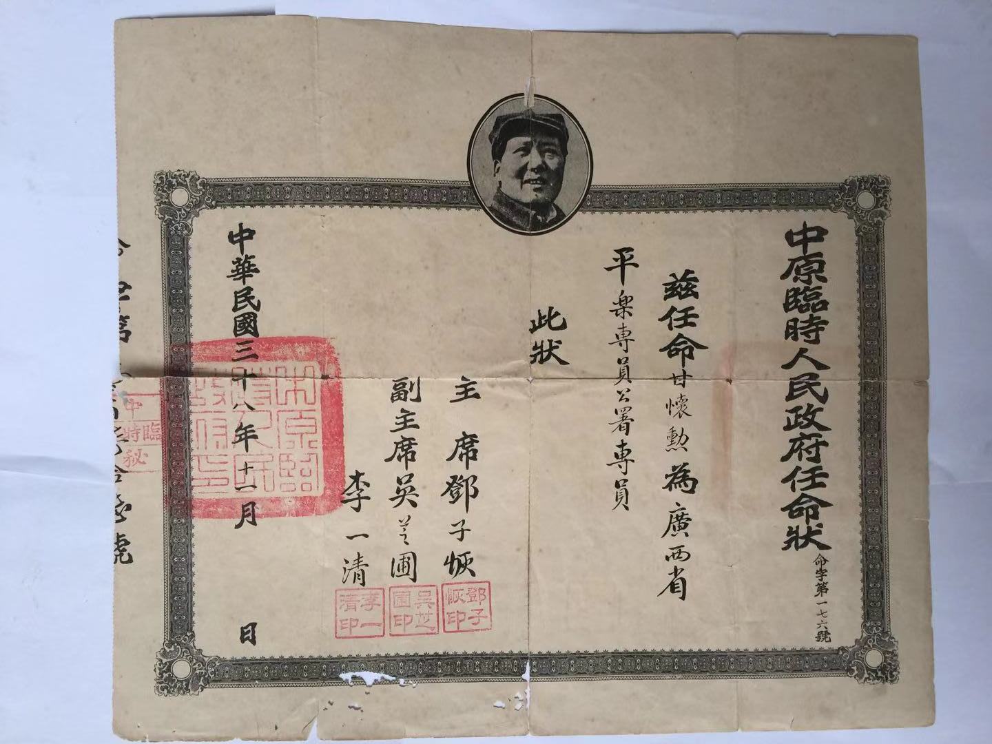 该任命书是解放战争时期由中原临时人民政府发的任命书,任命甘怀勋为广西省平乐专员公署专员,现由甘怀勋家属捐赠给广西革命纪念馆。