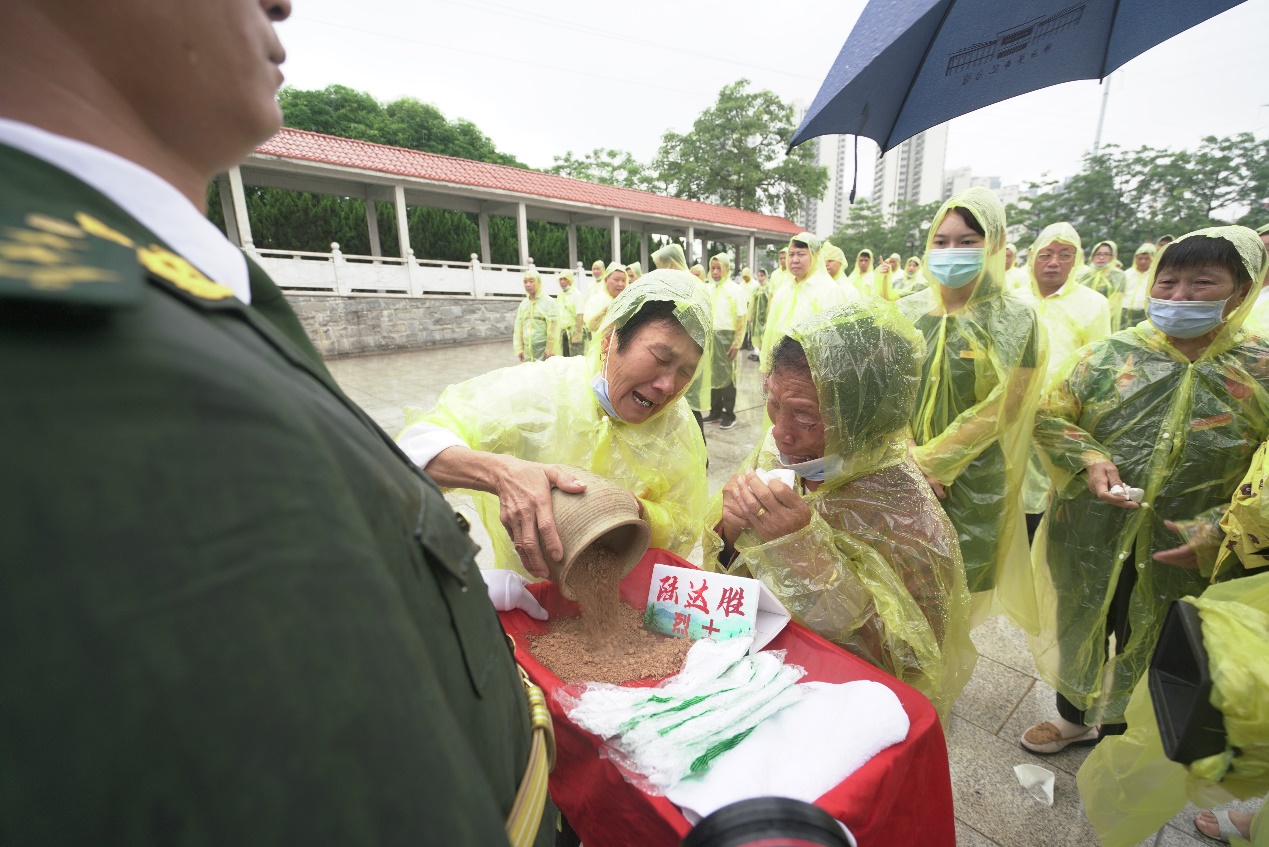 陆达胜烈士的大妹陆凤㚢及二妹陆秋㚢从礼兵手中接过陶罐的刹那,眼泪便如决堤的洪水,止不住地往下流:“我的哥哥哟,我们找你找得好苦哟;大半个世纪过去,我们终于可以重圆”。