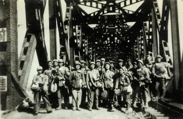 1951年6月22日,曹家麟(前排左一)作为中国人民志愿军67军199师政治部文工队队员,跟随部队跨过鸭绿江前在桥头合影。